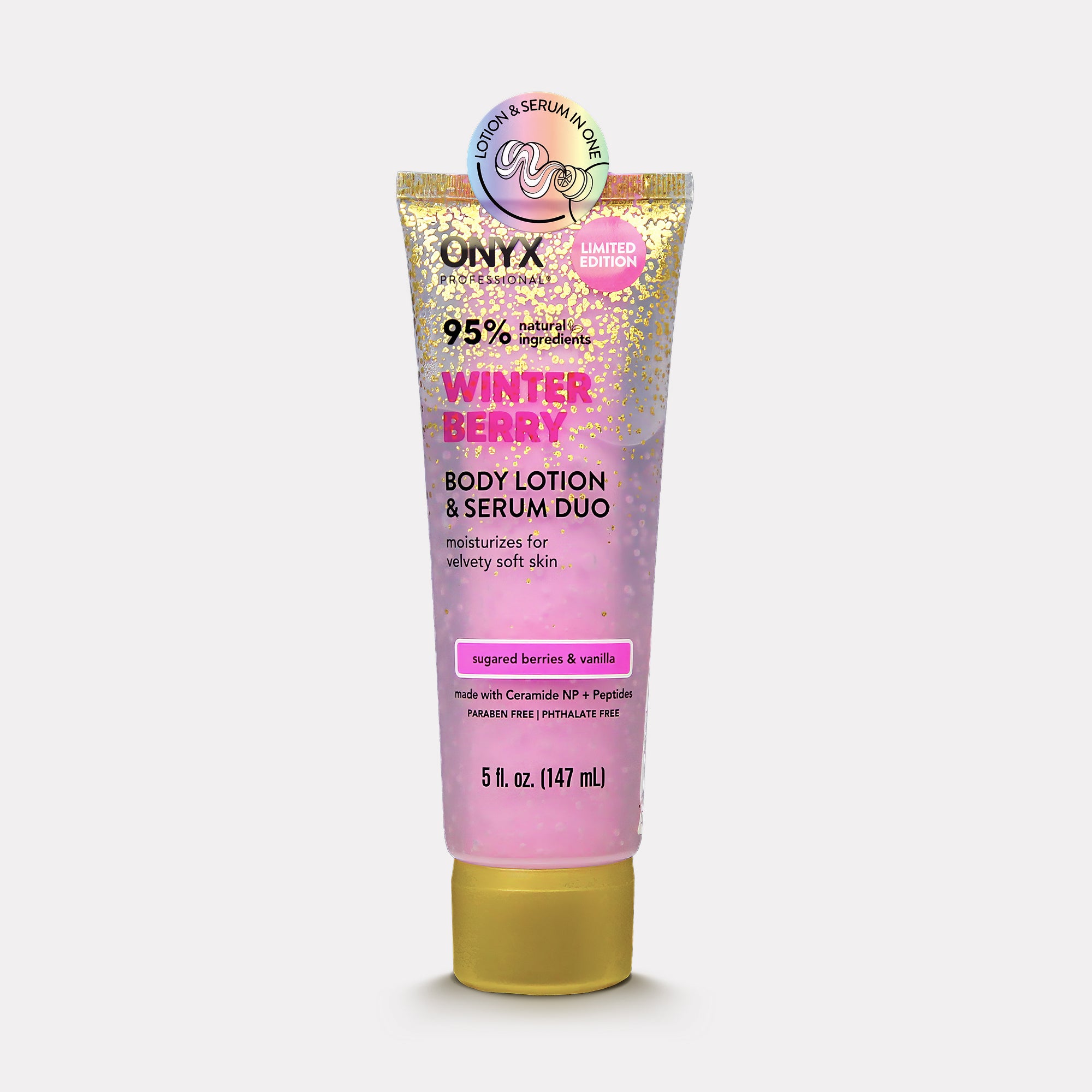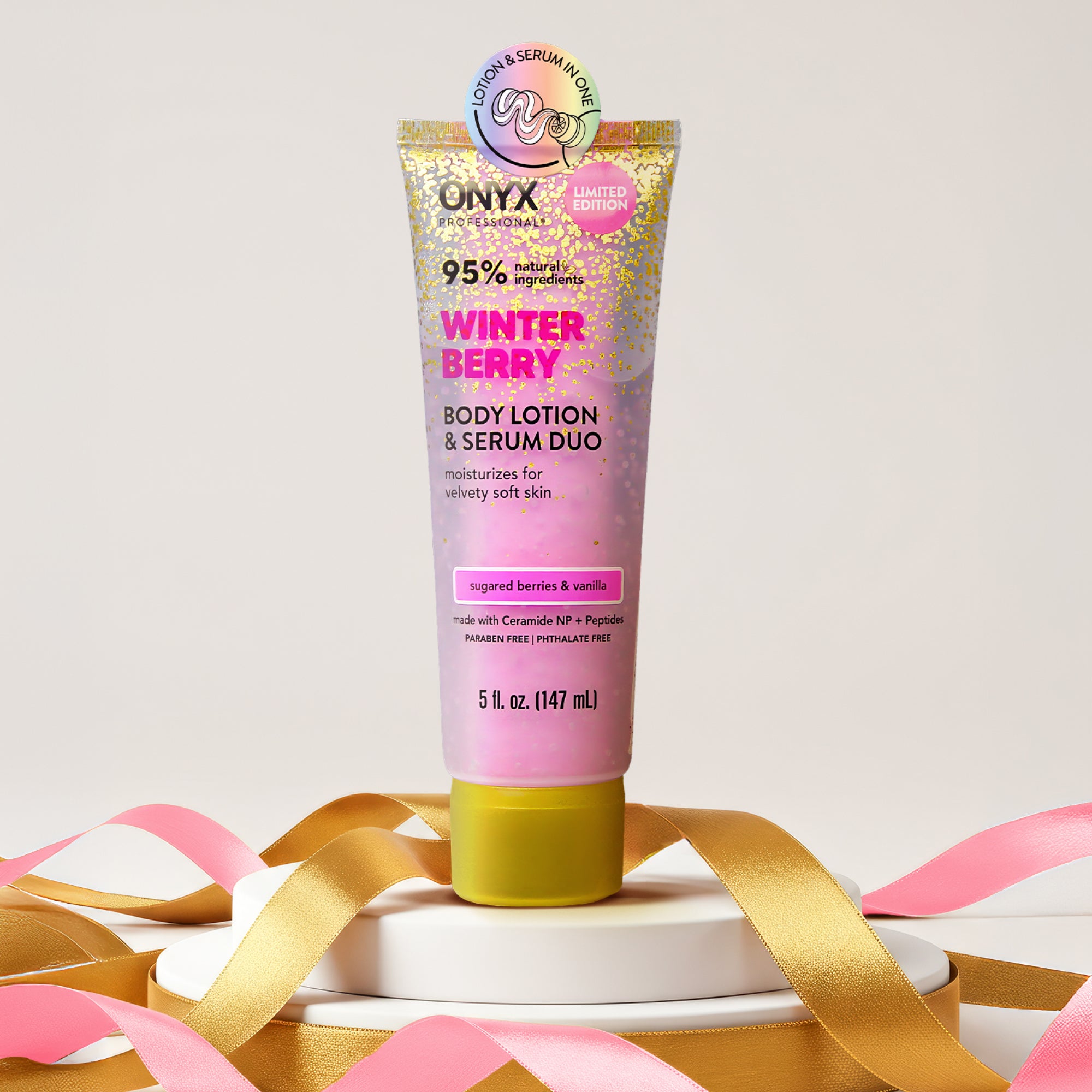 Indulge in the Winter Berry Hydrating Body Lotion & Serum Duo by ONYX Professional, a luxurious skincare experience featuring a limited-edition holiday fragrance. This velvety duo combines a nourishing lotion and serum, enriched with Ceramide NP to lock in moisture and strengthen the skin barrier for long-lasting hydration.
