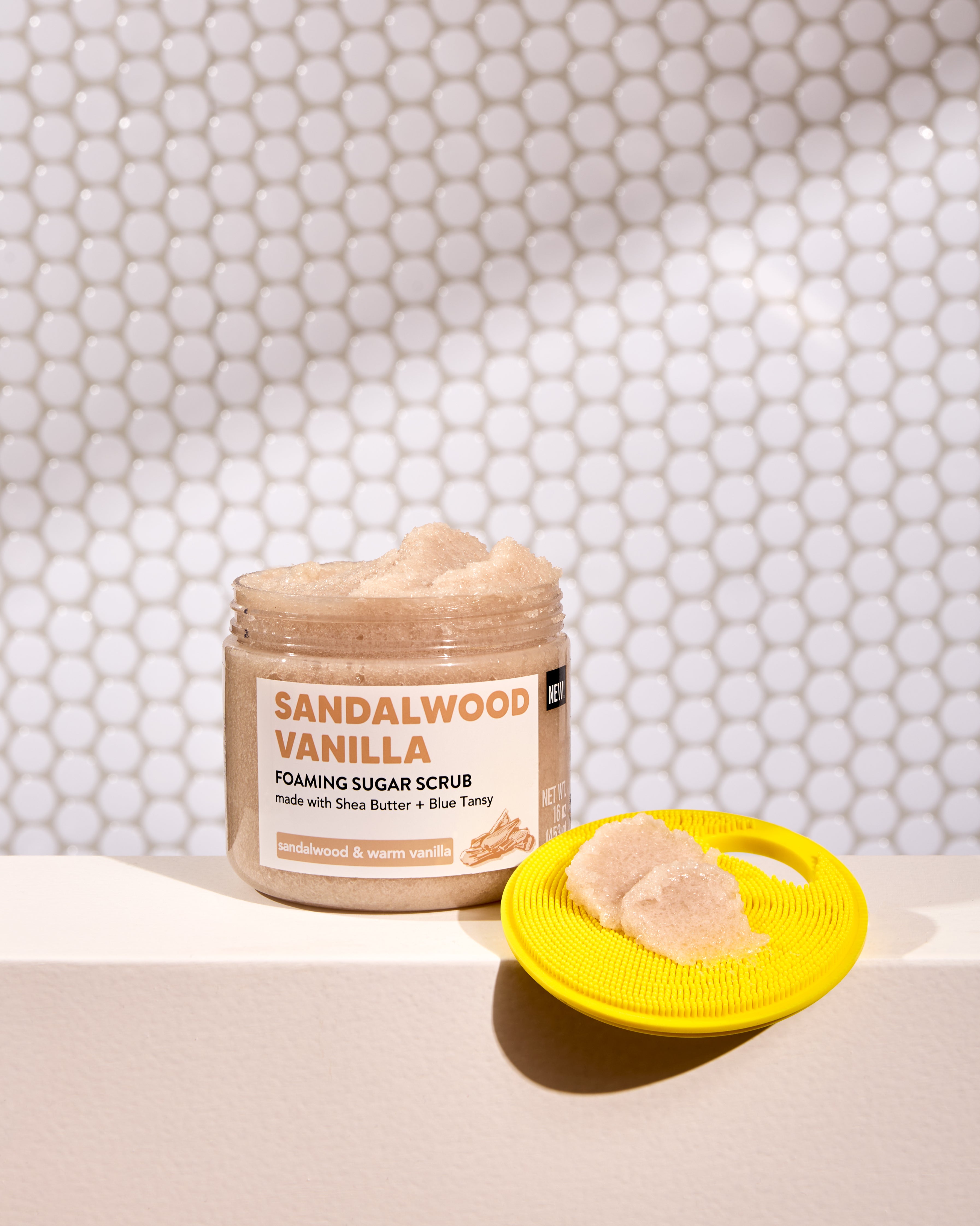 Add foaming sugar scrub directly to the included scrubber and massage in circular motions onto wet skin. Rinse clean and pat dry.