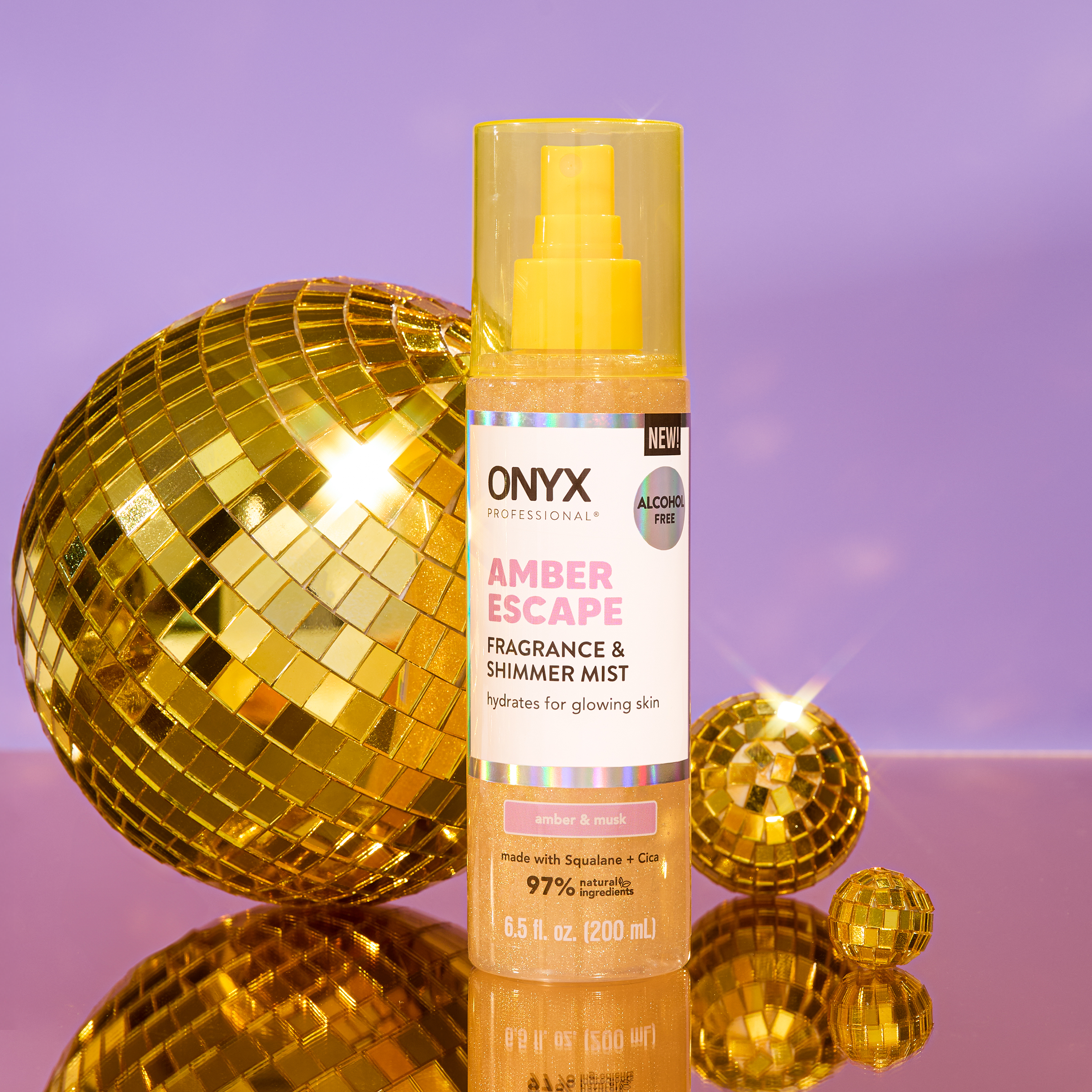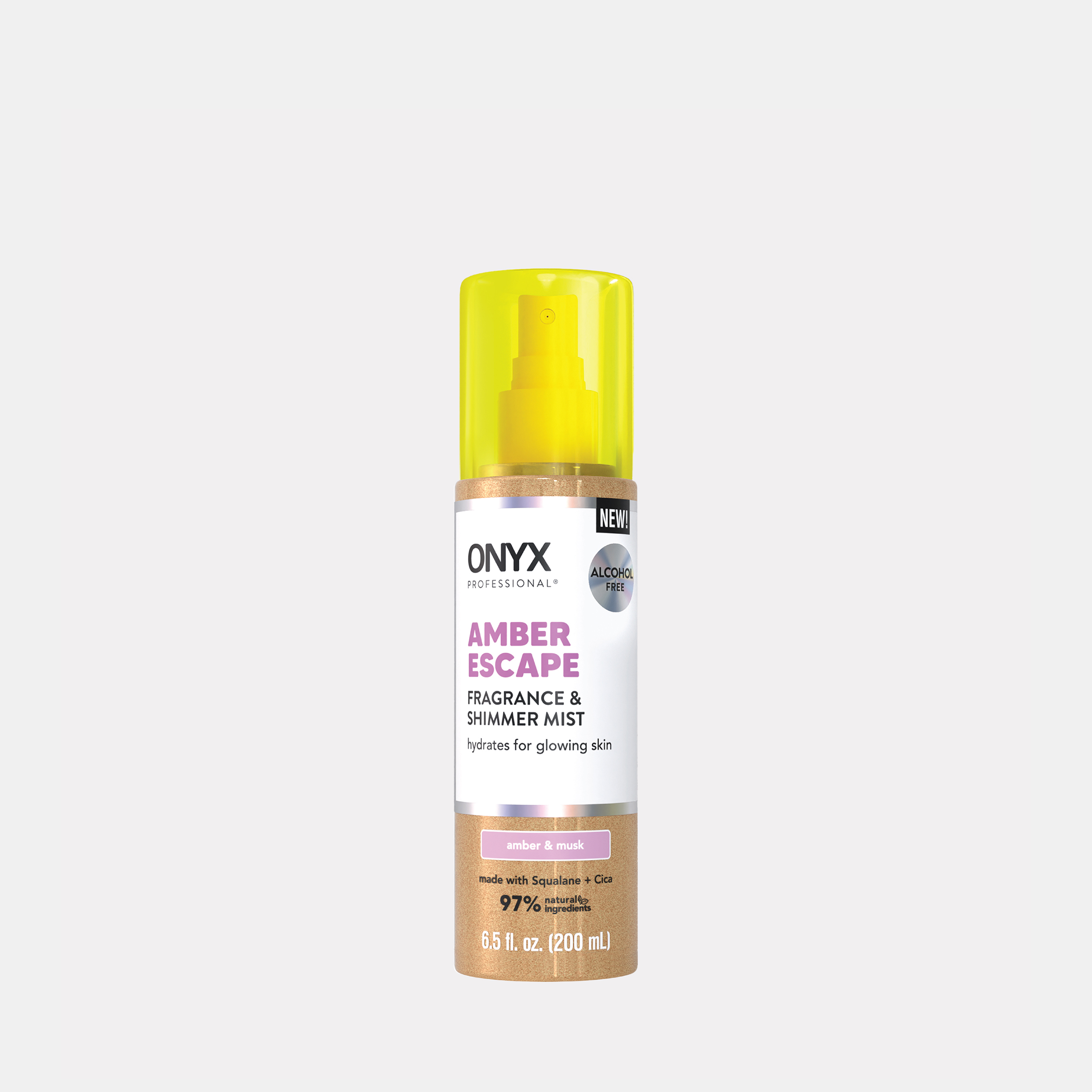 Unlock the secret to instantly glowing, nourished skin with the ONYX Professional® Amber Escape Hydrating Fragrance & Shimmer Mist, a game-changer for your skincare and self-care routine. At the core of this elixir is plant-based Squalane, your skin's BFF, and Cica, an ingredient known to offer anti-inflammatory and skin calming properties. Together, they create a powerful skincare duo that's designed to give your skin the hydration it deserves. The result is dewy, healthy-looking skin that shimmers.