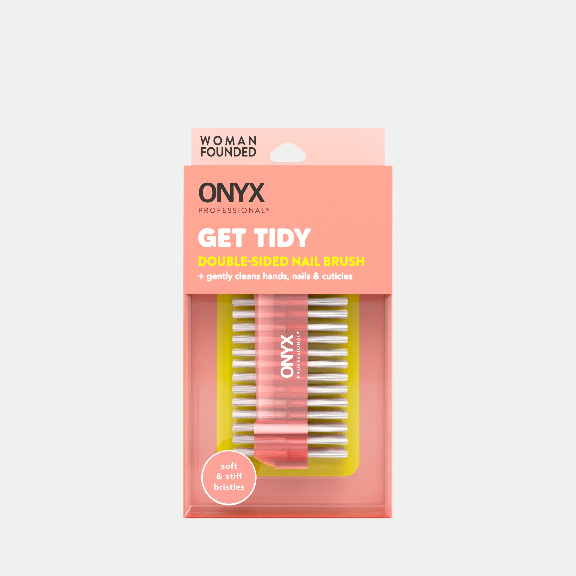Achieve impeccably clean nails with the Onyx Professional Get Tidy Double-Sided Nail Brush. This brush effectively removes dirt and debris from both fingernails and toenails, offering a comprehensive clean. Featuring a dual-sided design, one side is equipped with short, stiff bristles for thorough cleaning, while the other side boasts long, soft bristles perfect for gentle exfoliation and care. Ideal for both professional manicurists and those perfecting their at-home nail care routine, the Tidy Up Double-Sided Nail Brush is a must-have tool for anyone looking to elevate their manicure or pedicure experience.