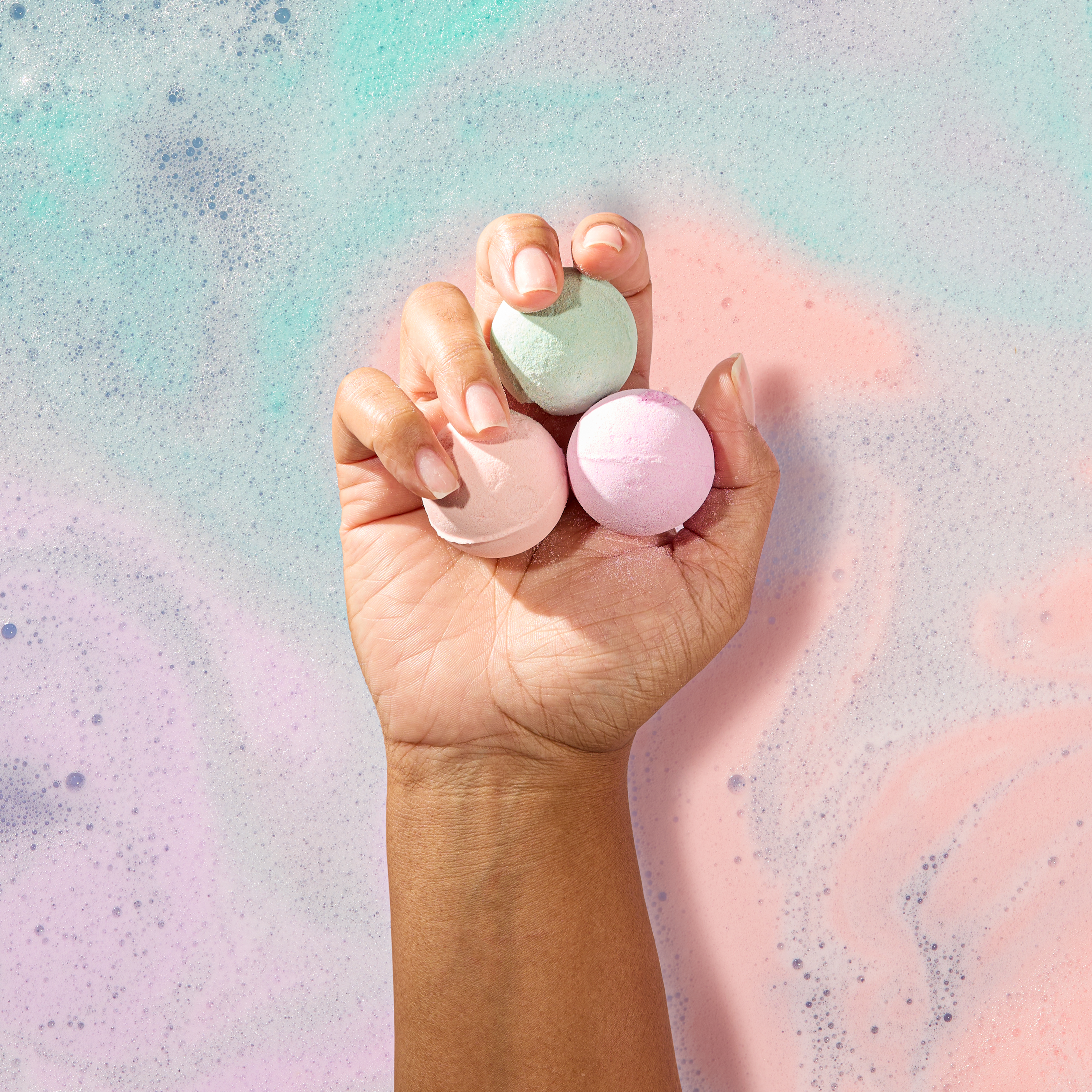 Each jar contains 4 Coconut Bliss, 3 Amber Escape, and 3 Rose Petals bath bombs.