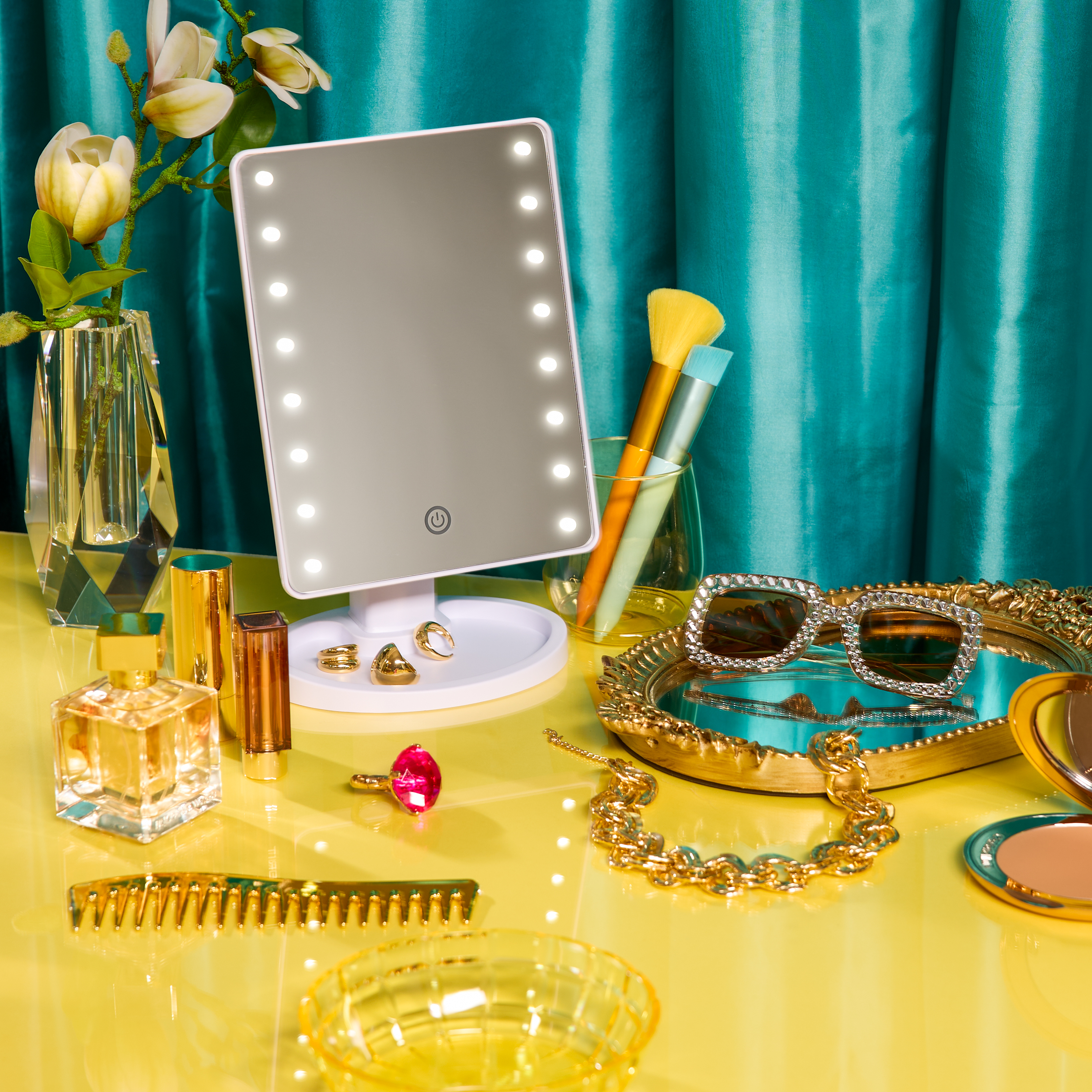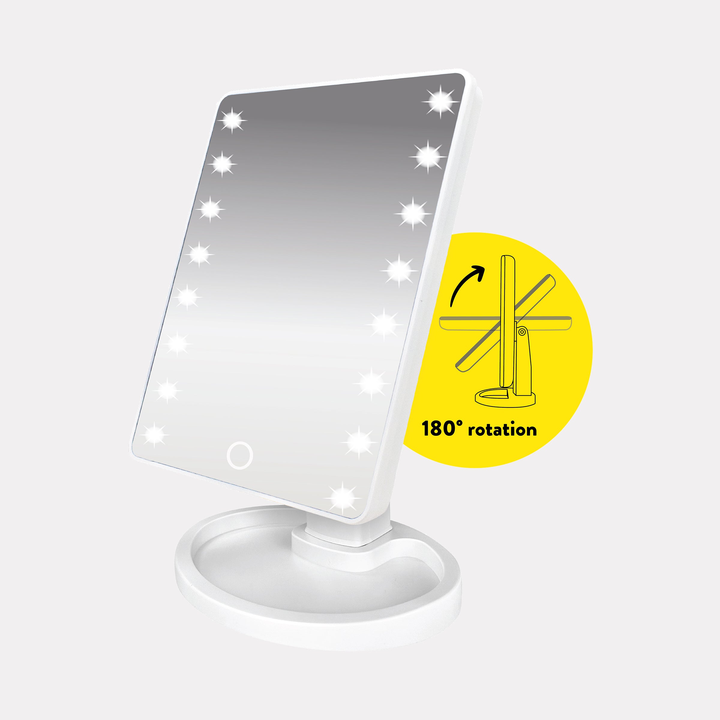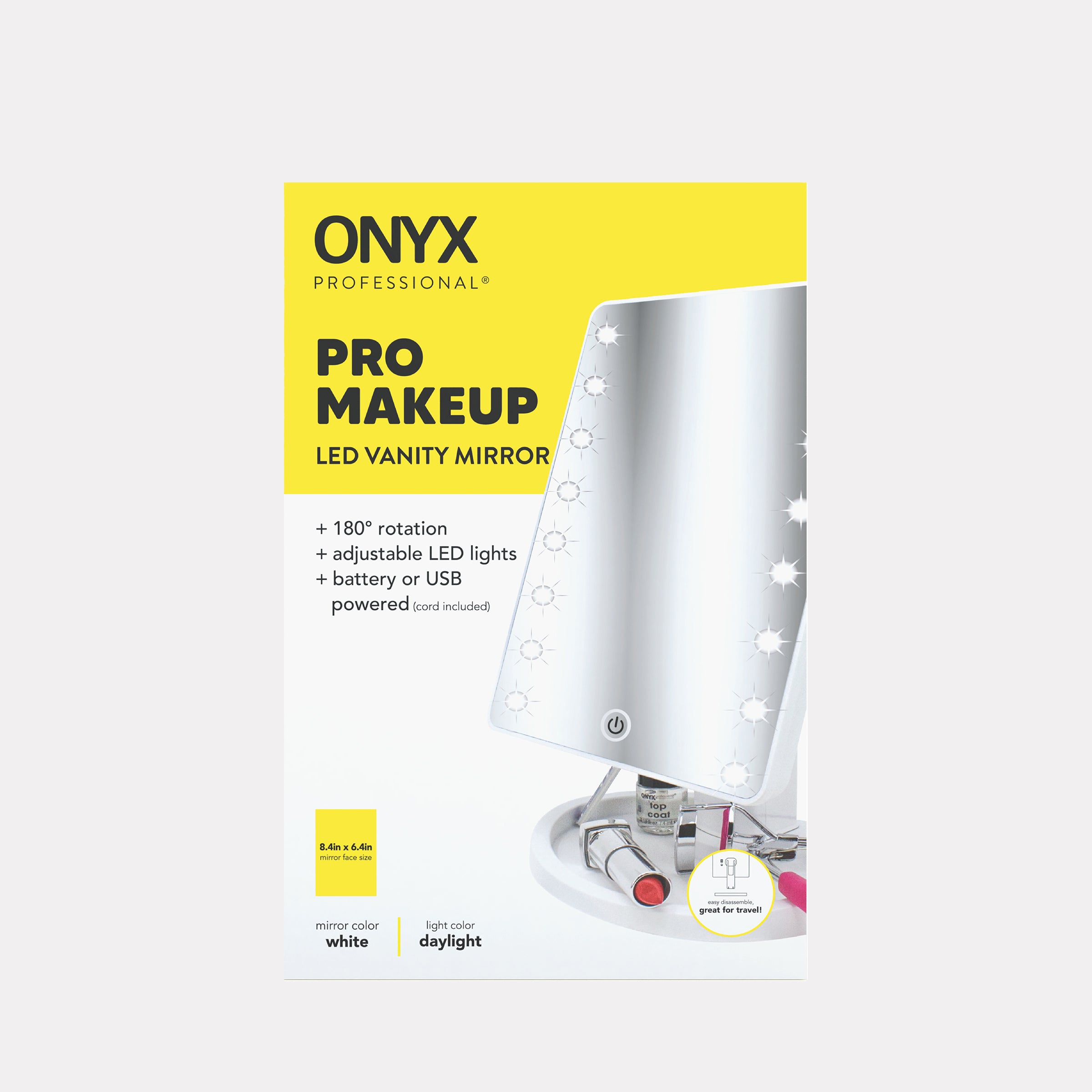 The ONYX Professional LED Pro Makeup Vanity Mirror is designed to help you achieve flawless makeup application. Featuring 16 dimmable LED lights, this mirror ensures flawless, glam-worthy lighting every time. Its 180° rotating stand provides the flexibility to find the perfect angle, whether you're at home or on the go. Easily adjust the brightness with a simple touch, customizing the light to suit your needs. Powered by either the included USB cable or optional batteries (not included), this mirror adapts to any setting. The sturdy base doubles as a convenient organizer for makeup and accessories, keeping everything within reach.