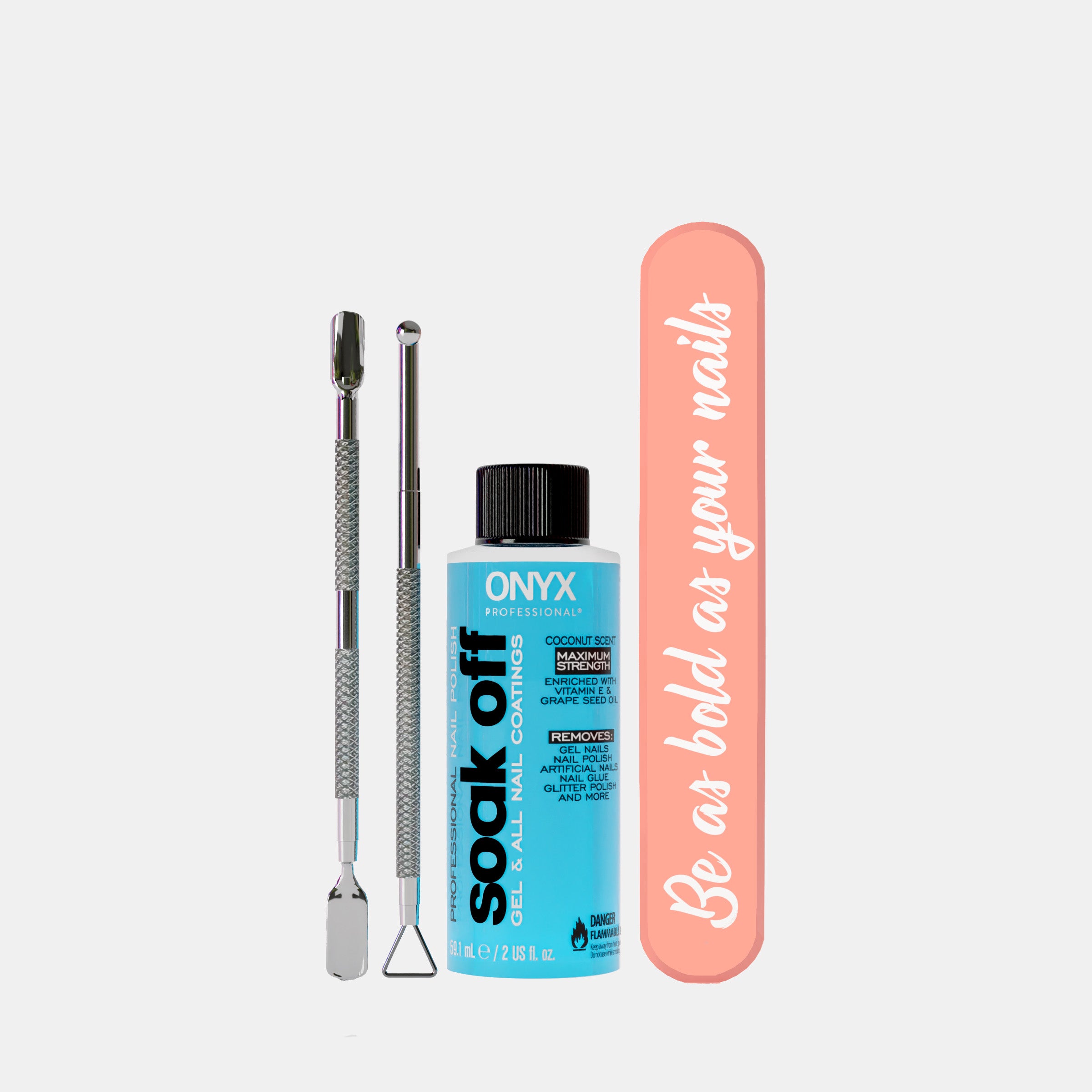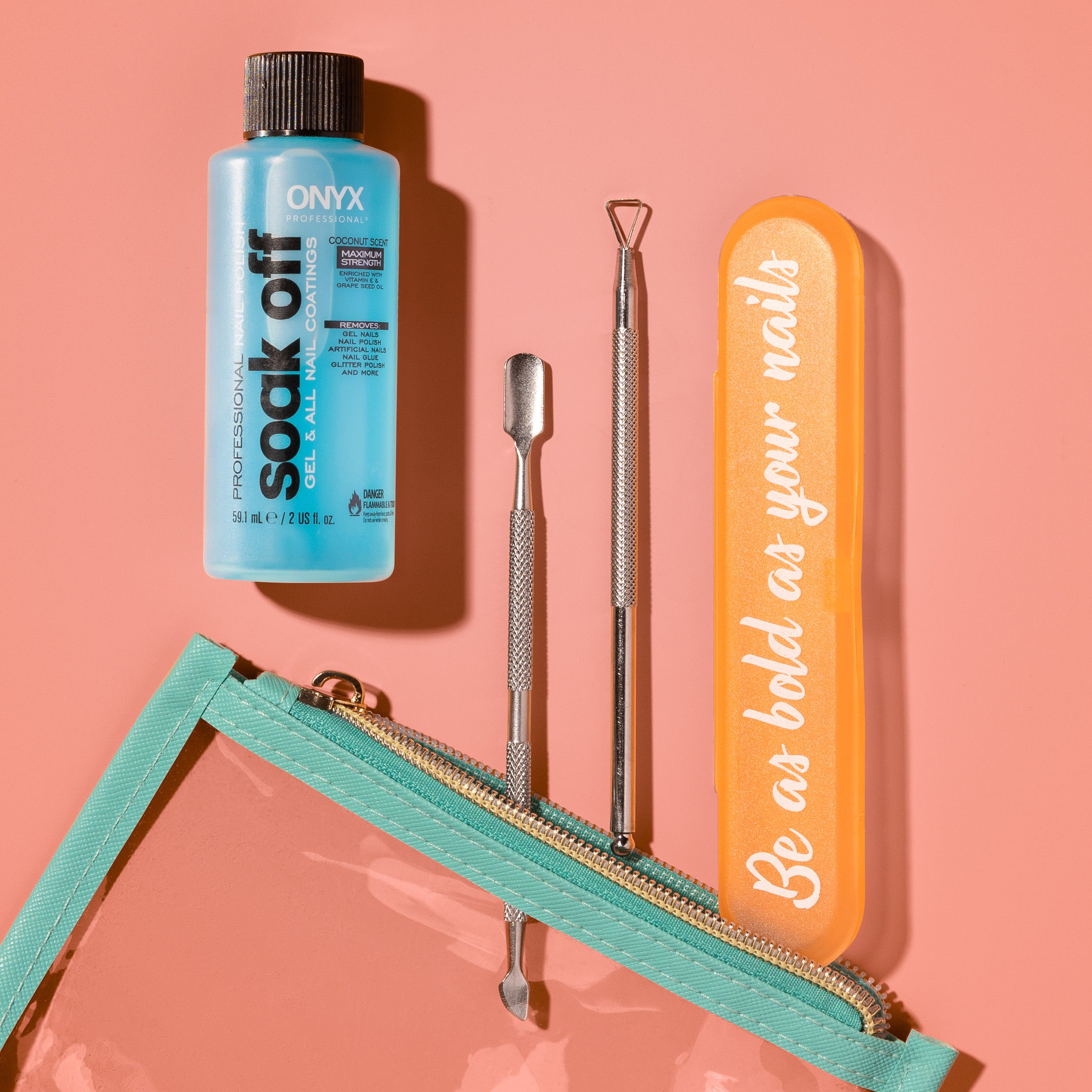 The ONYX Professional® Soak Off Essentials Tool Kit is your ultimate companion for seamless gel polish removal. This easy-to-use kit contains everything you need for pristine, ready-for-anything nails, including a 2 oz Coconut-scented Soak Off Remover Gel, two double-sided polish removal tools crafted from durable stainless steel, and a travel-friendly tool case. Experience salon-quality strength nail polish remover, enhanced with Vitamin E and Grape Seed Oil for nourished, beautiful nails.