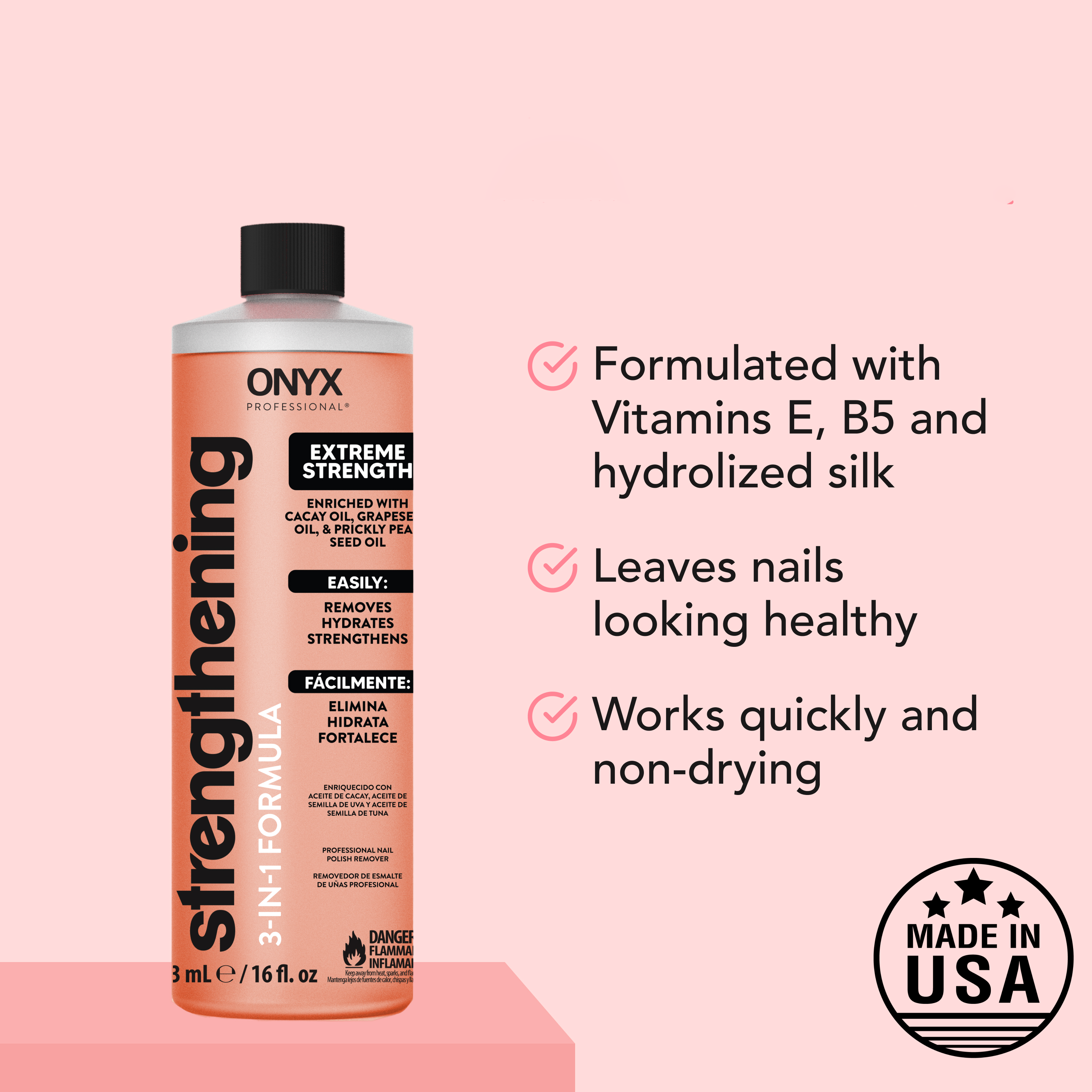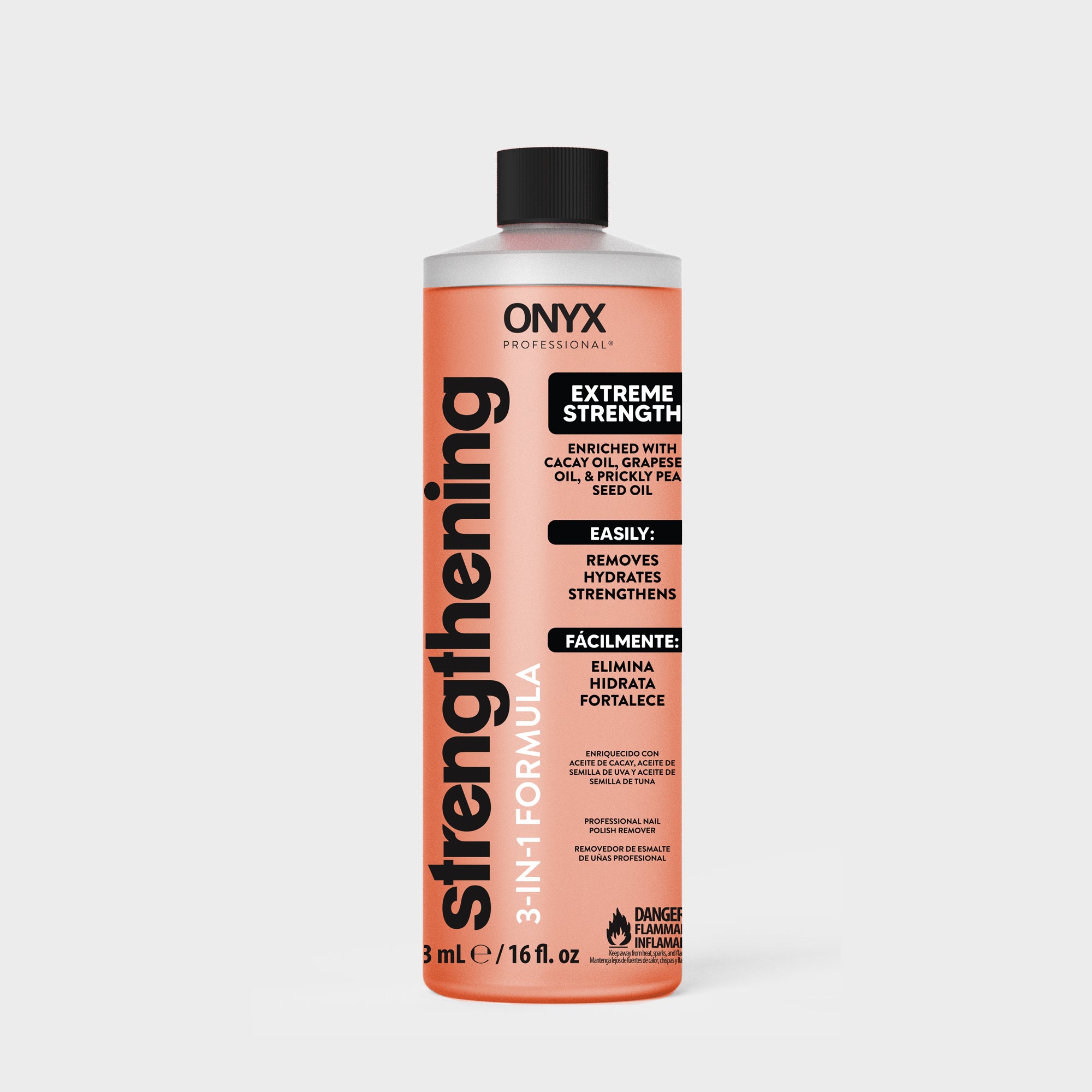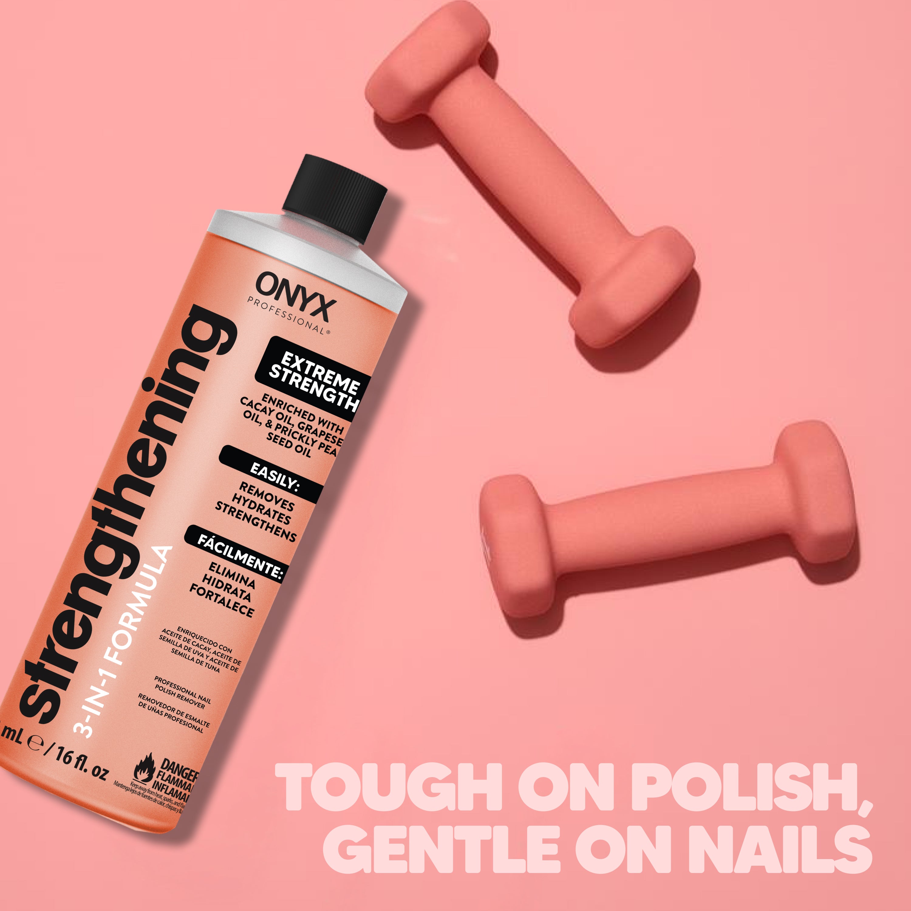 ONYX Professional Strengthening 3-in-1 Nail Polish Remover is part of a powerful strengthening regimen when paired with Hard as Hoof Nail® Strengthening Cream to restore, fortify, and protect your nails – and your manicure.