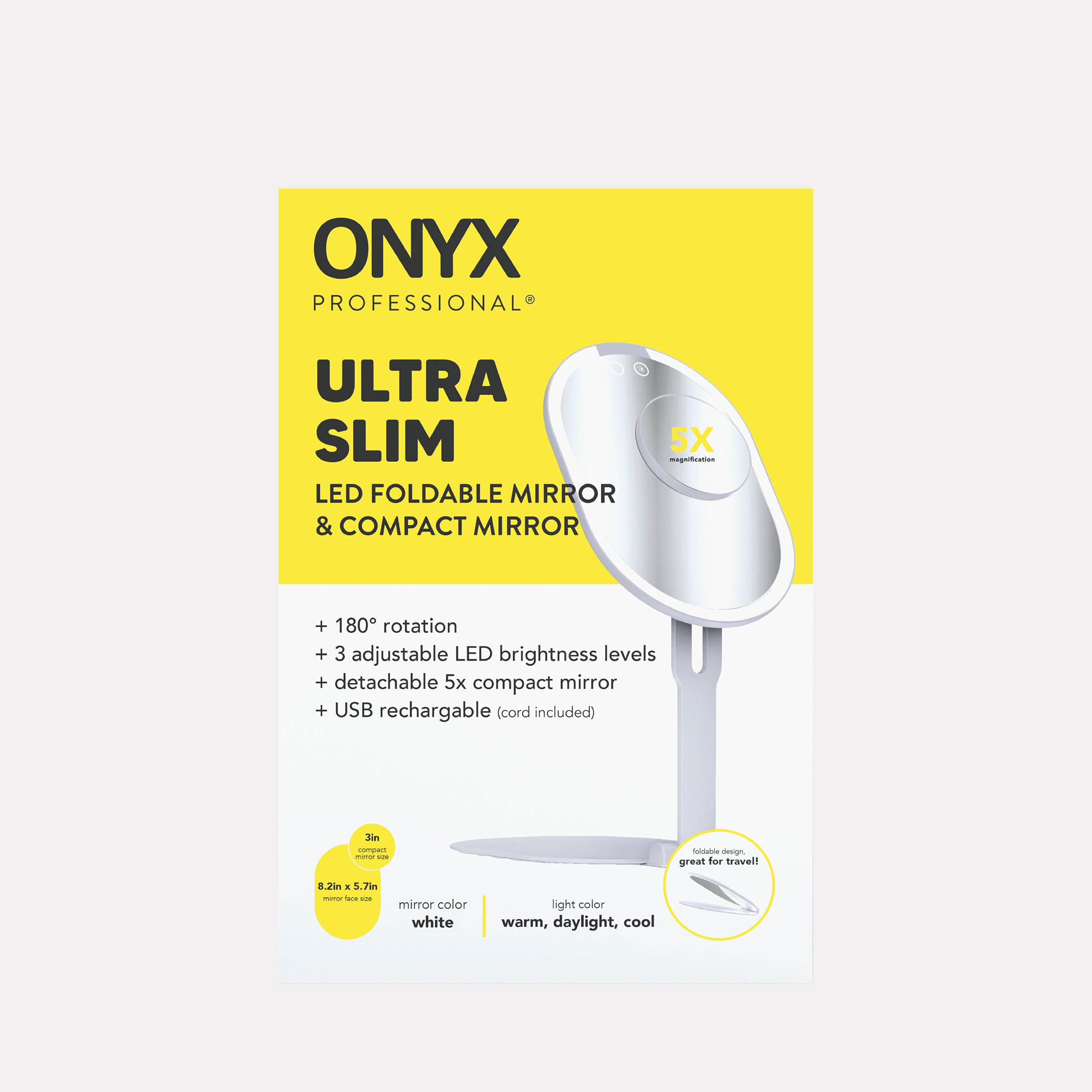 This ONYX Professional Ultra Slim Makeup Mirror features a sleek, modern design for ultimate convenience. Get precision detail with the powerful 10x magnifying mirror that attaches magnetically for easy use with the foldable mirror or to take separately on-the-go. The mirror offers three versatile light color options—warm white, daylight, and cool white—so you can always find the perfect lighting for any setting. Weighing under 1lb, this foldable mirror easily fits into a handbag, suitcase, or drawer for effortless portability.