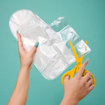 1: Soak feed in warm, soapy water. Lightly dry feet. Open pouch and remove booties. Cut along top of mask and insert feet. To adjust size, use included tape.